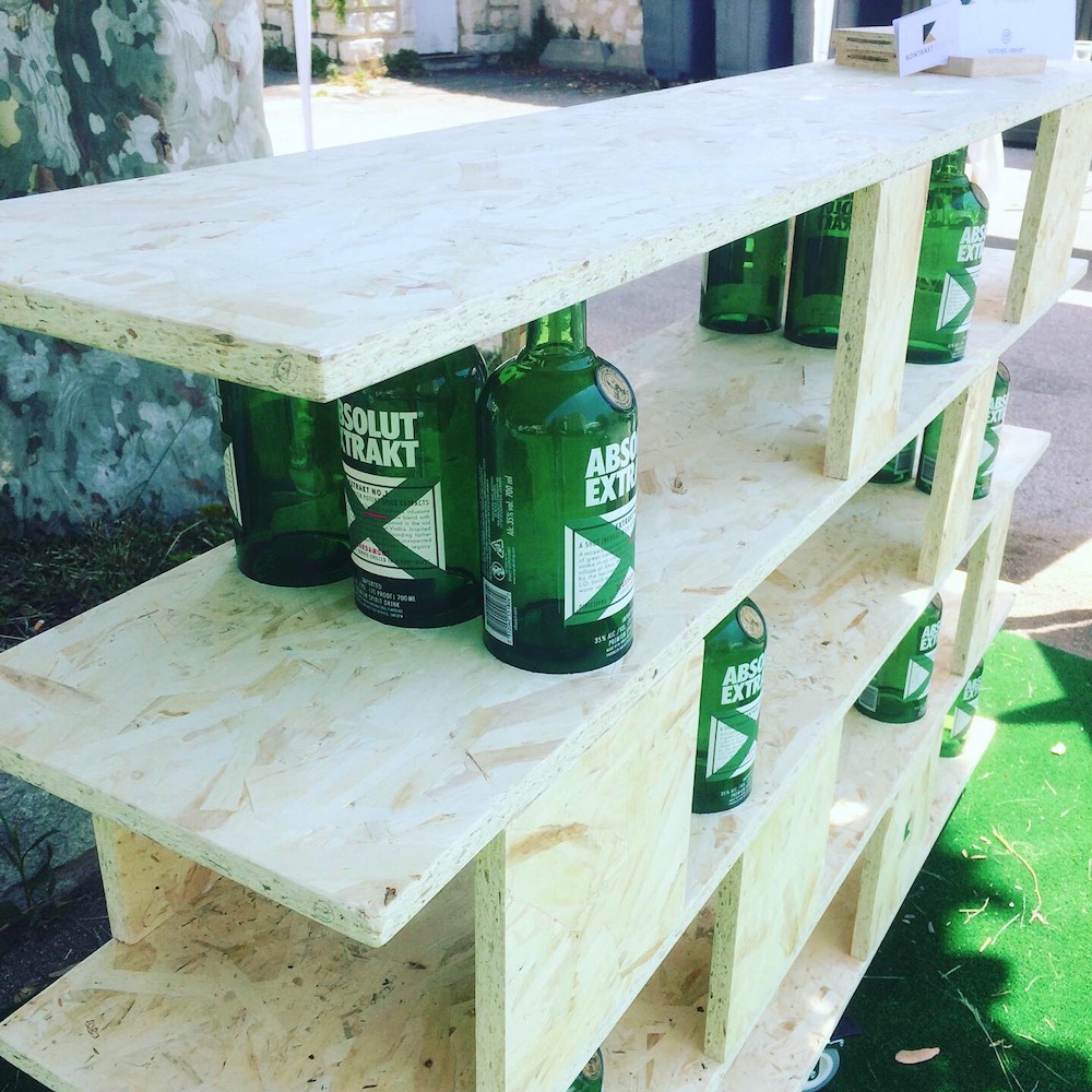 Une démonstration d’upcycling en live. On intervient dans les locaux de l’entreprise le jour du lancement en interne. Au programme, DJ, bar à cocktails, photo booth… Les bouteilles utilisées par les barmans nous sont transmises dès qu’elle sont vidées pour que l’on puisse monter le meuble que l’on a créé pour l’occasion et ainsi sensibiliser le personnel à l’économie circulaire.