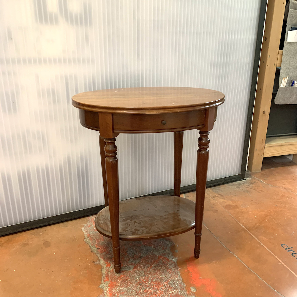 Cette table d’appoint en bois, réalisée au milieu du XXᵉ siècle, s’inspire d’un vocabulaire classique reconnaissable à son plateau ovale mouluré, son tiroir en ceinture et ses pieds tournés reliés par une tablette basse elliptique.